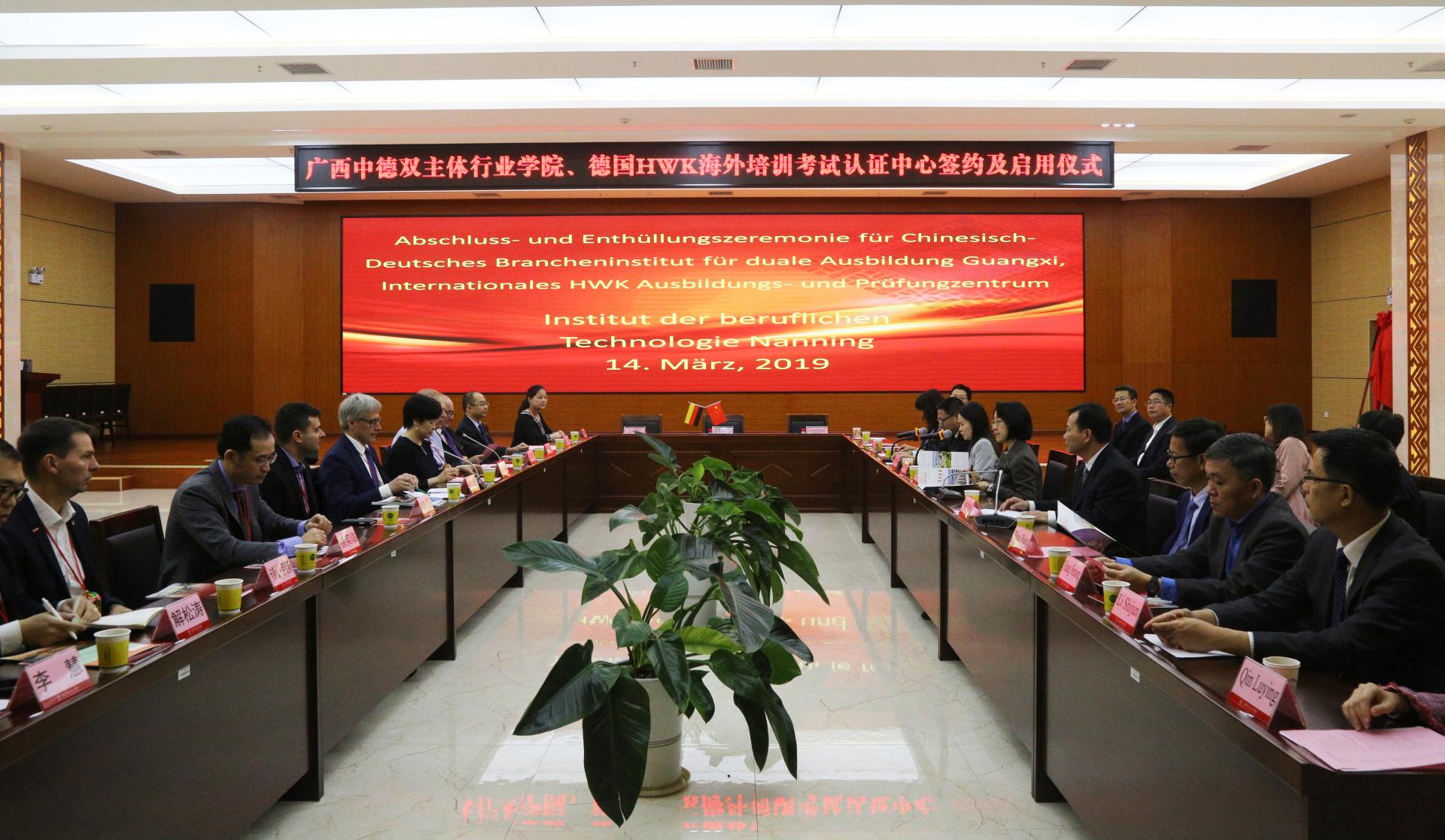 会晤交流结束后,与会领导一同见证了广西中德双主体行业学院、德国HWK海外培训考试认证中心的签约及启动仪式。