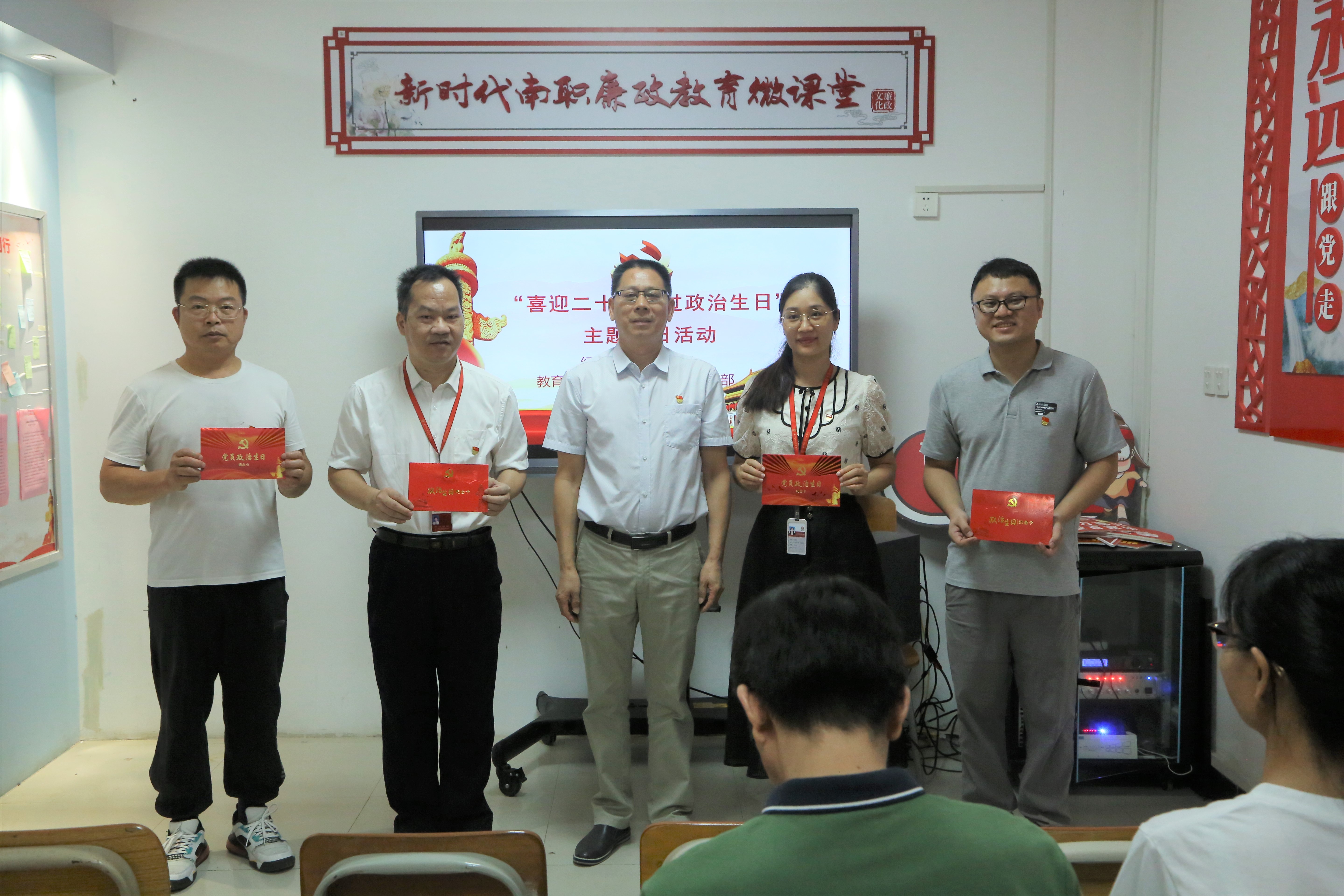 杨清源为5-7月份入党的四名党员送“政治生日”纪念卡、致贺词,并带领全体党员重温入党誓词。他指出,作为一名共产党员,要保持对党忠诚,坚定理想信念,注重党性修养,永葆共产党员的先进本色。希望大家在疫情防控、学校“双高”建设和升本工作中尽职履责、勇于担当、甘于奉献,以实际行动践行“一名党员就是一面旗帜,一个支部就是一座堡垒”。