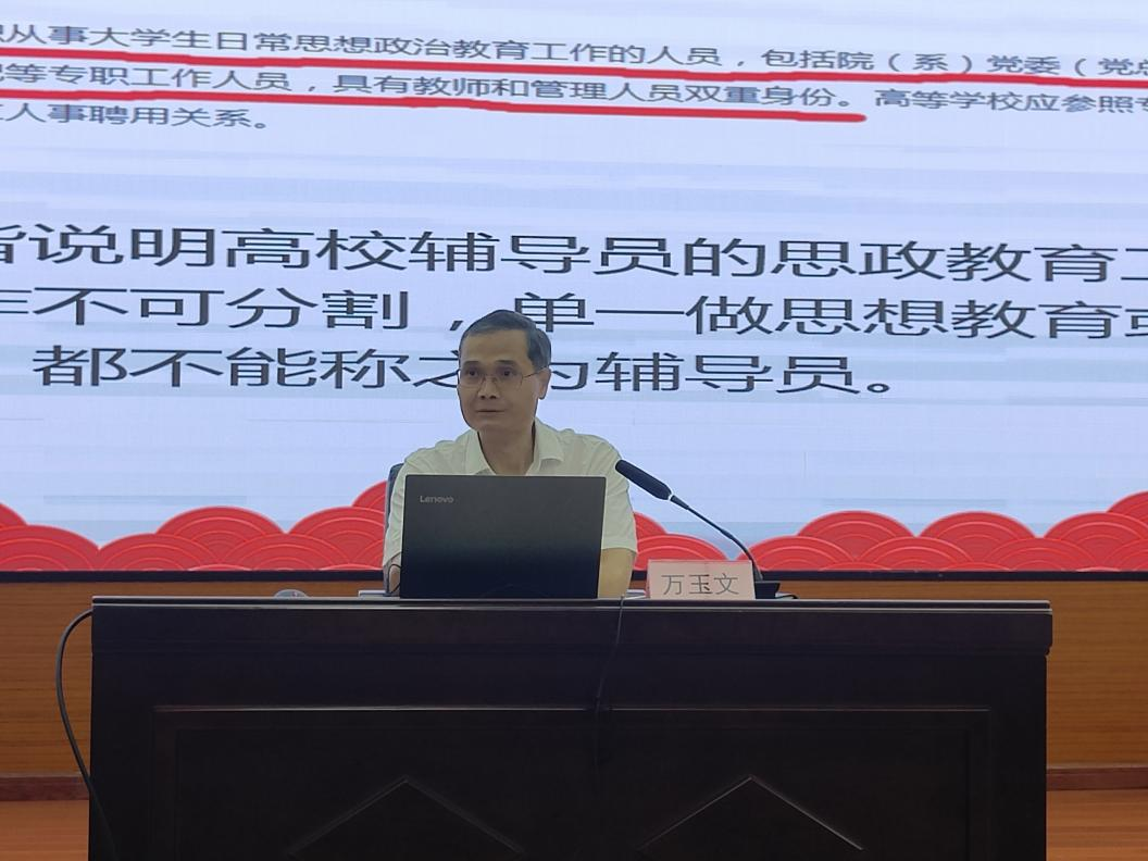 培训会上,学校副校长万玉文作了题为《守正创新促发展精业笃行践初心》的学生管理育人工作专题报告。他从政策文件出发,深入解读辅导员的工作职责及角色定位,并就学生管理的内涵发展提出具体要求:一是提高政治站位,抓实学生工作;二是把握学生工作标准,做好“教管服”;三是注重能力提升,加强指导与培训;四是加强检查督促落实,形成育人合力。